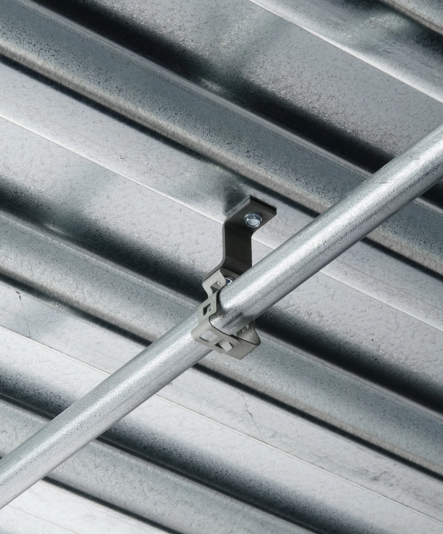 - Supports conduit or pipe 1-1/2" (38 mm) under the roof decking to prevent potential damage from nails or screws