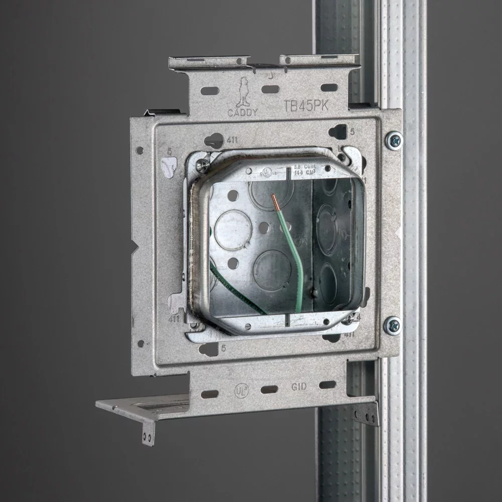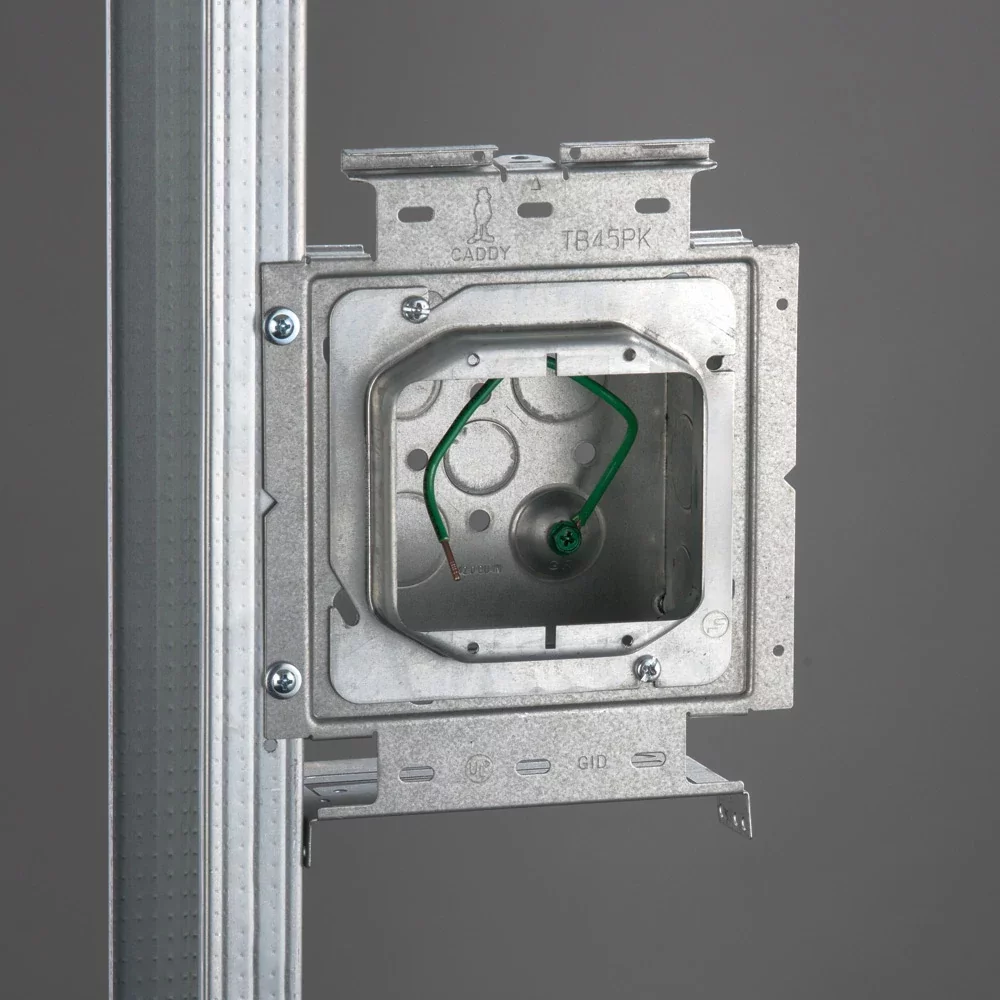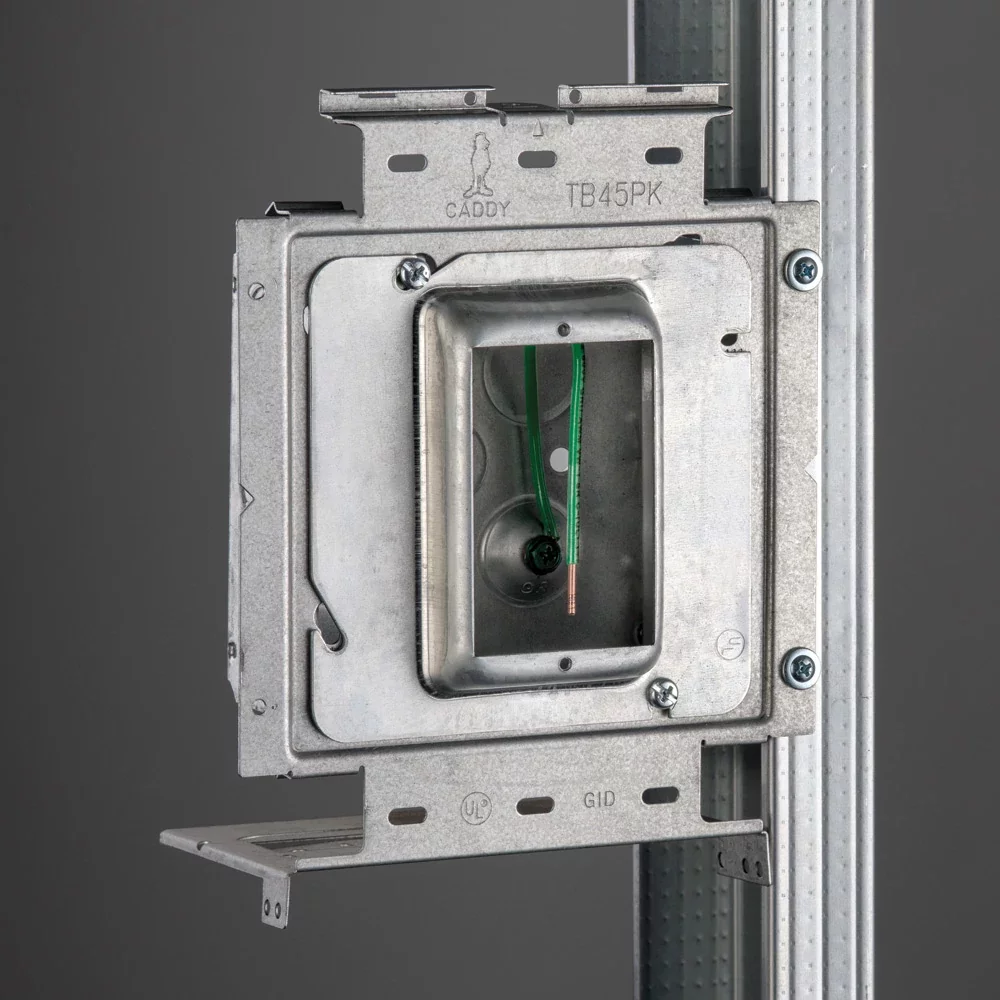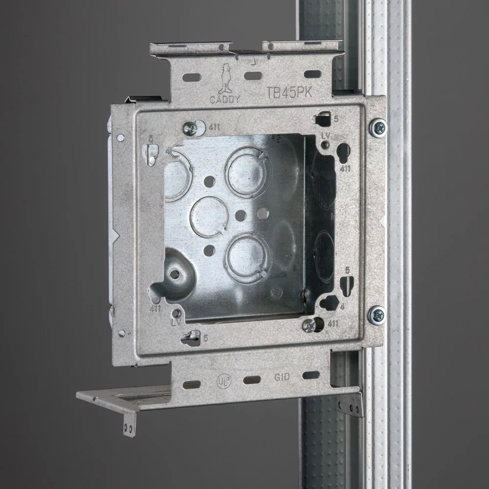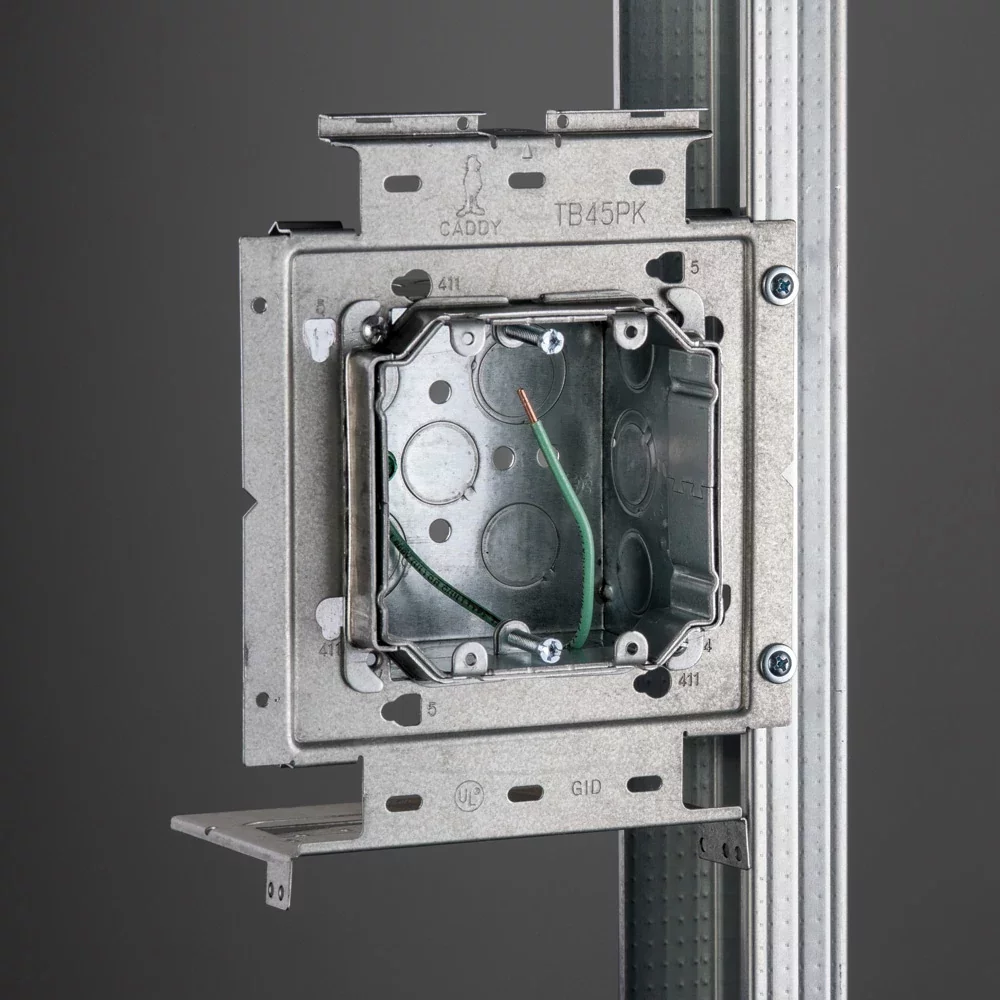 The nVent CADDY Box Mounting Plate with Far Side Support on Stud Assembly line increases overall productivity, savings, and job site safety. For ultimate flexibility, the assemblies are configured with the most common box and mud ring combinations. The line is also offered in both standard and open back boxes as well as in single and double gang fixed or adjustable depth mud rings. When paired with the nVent CADDY Open Back Box, the assembly is ideal for prefab installations where devices, fittings, and cables are installed to quickly and easily complete make-up wiring connections, without the need to drop or work through the mud ring.