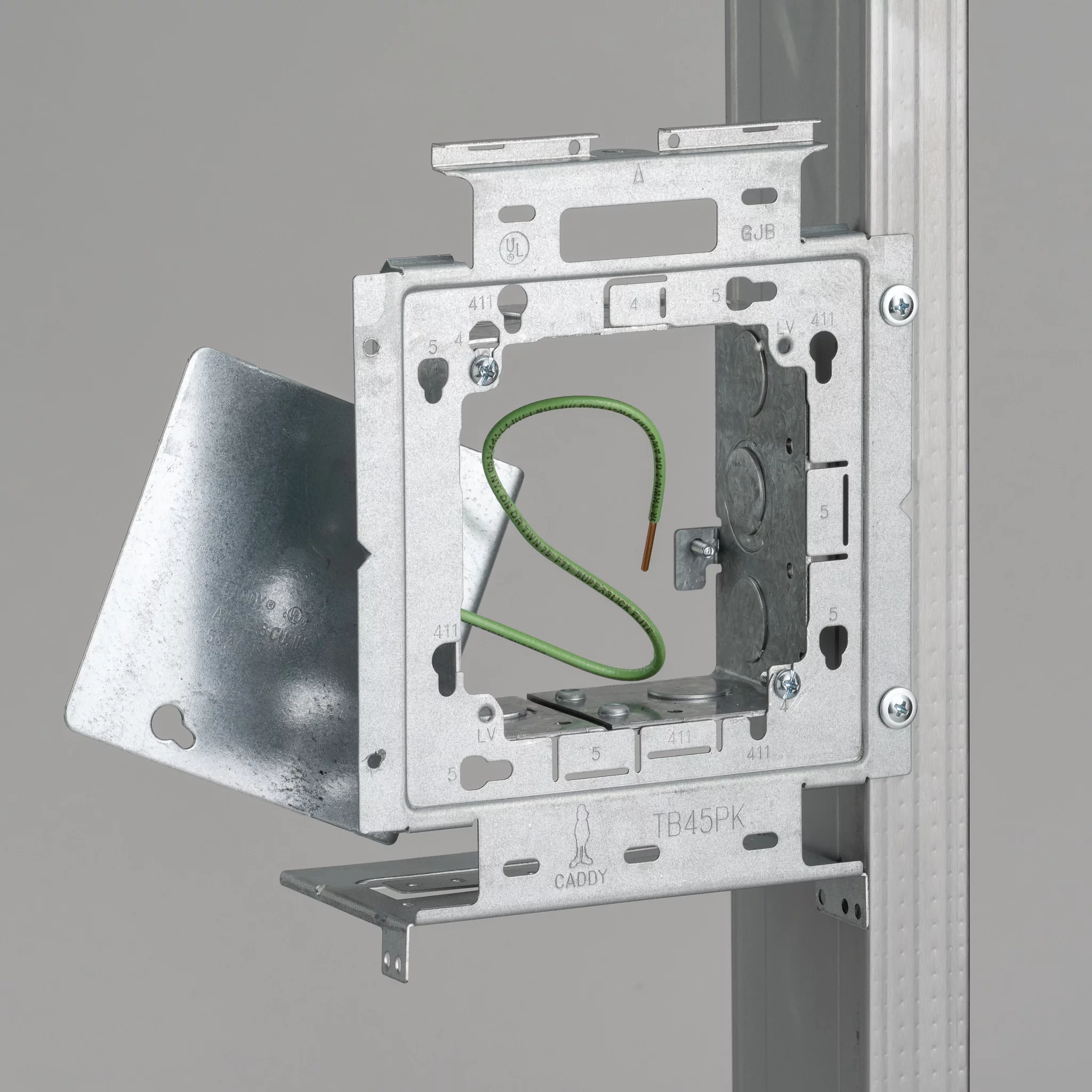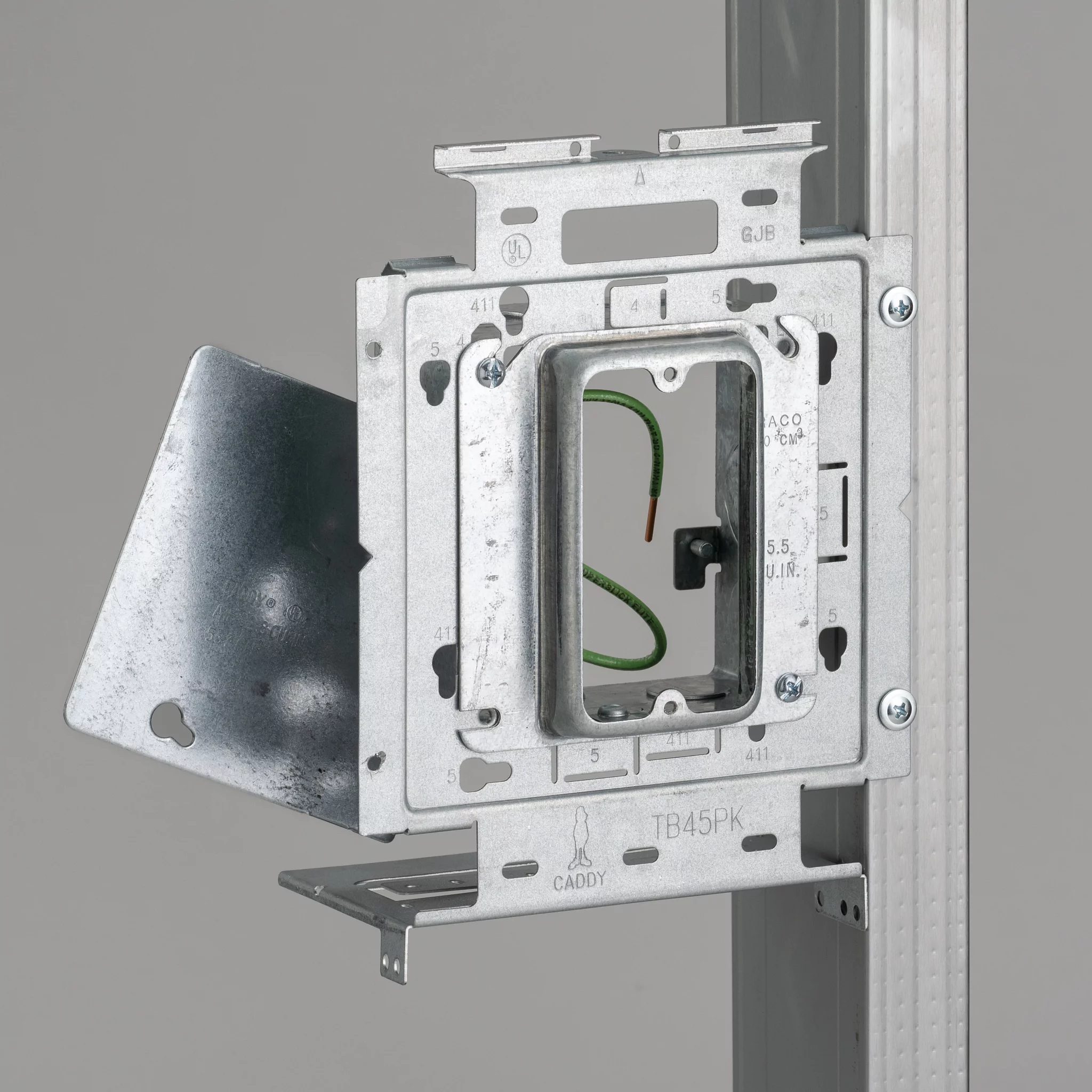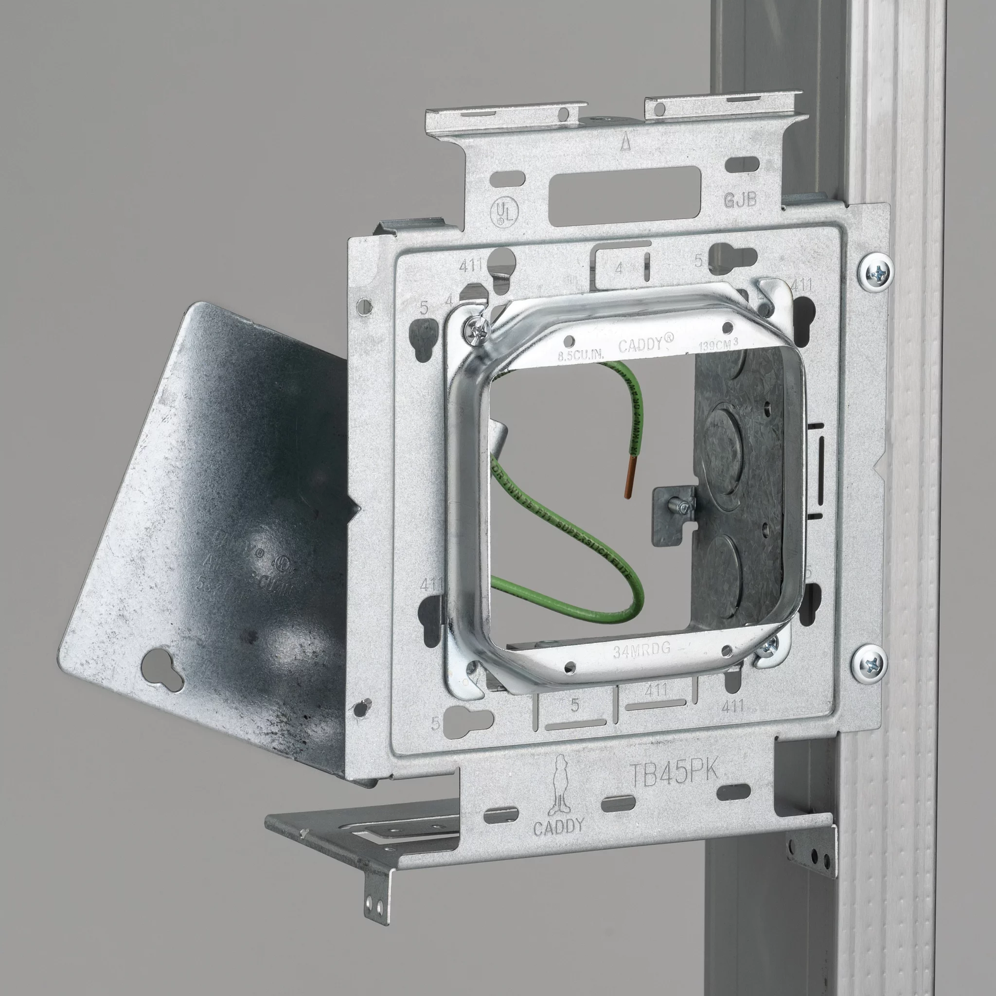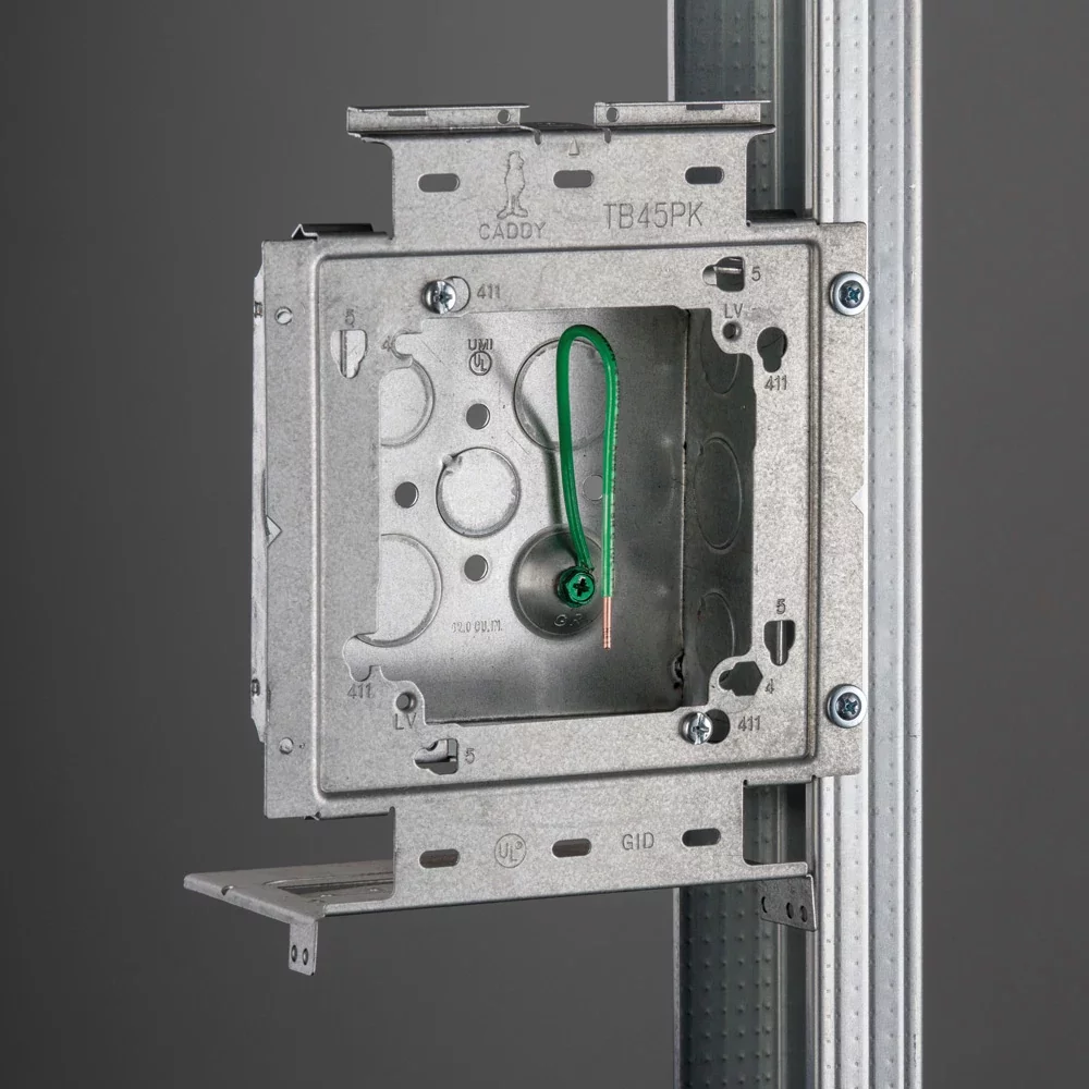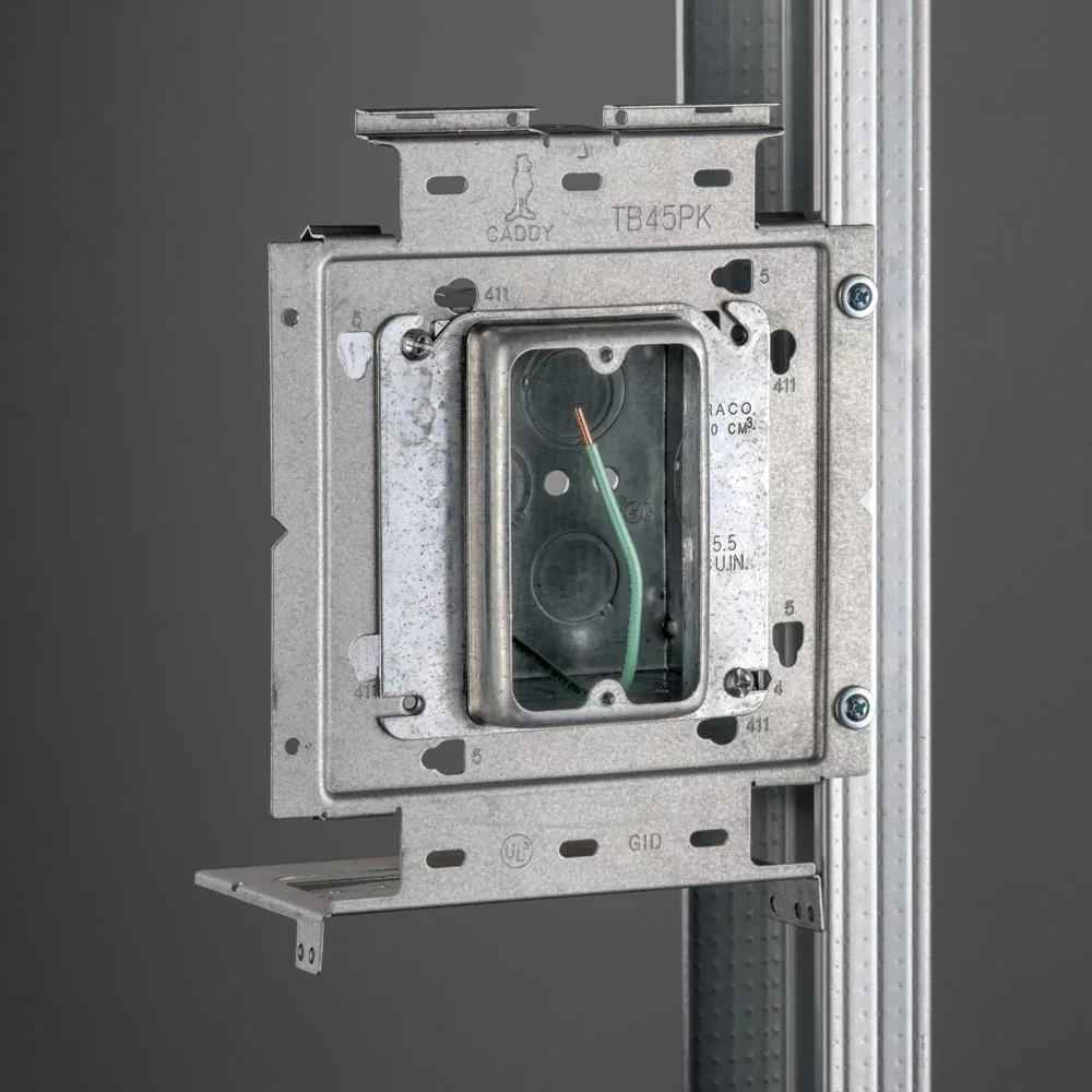 The nVent CADDY Box Mounting Plate with Far Side Support on Stud Assembly line increases overall productivity, savings, and job site safety. For ultimate flexibility, the assemblies are configured with the most common box and mud ring combinations. The line is also offered in both standard and open back boxes as well as in single and double gang fixed or adjustable depth mud rings. When paired with the nVent CADDY Open Back Box, the assembly is ideal for prefab installations where devices, fittings, and cables are installed to quickly and easily complete make-up wiring connections, without the need to drop or work through the mud ring.