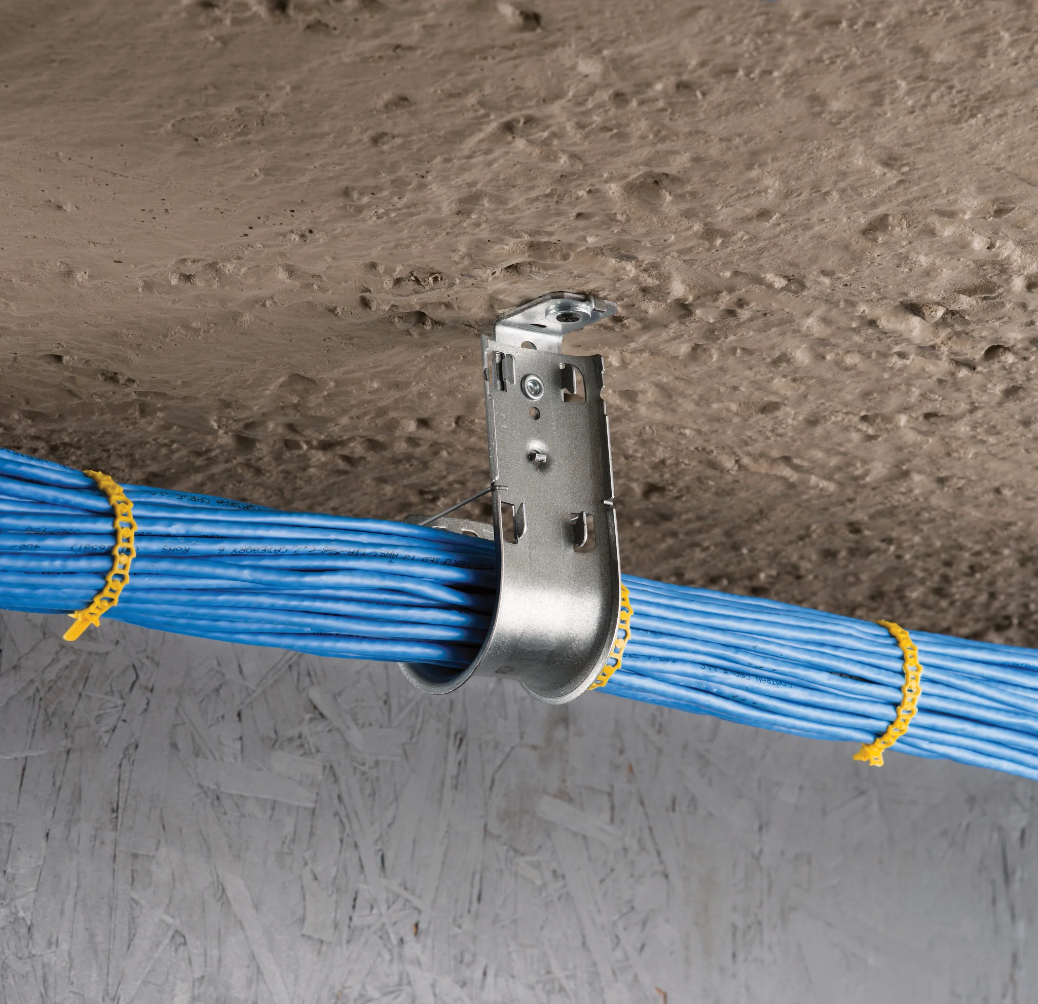 - Rounded edges on J-Hooks provide proper bend radius support for high performance data cables