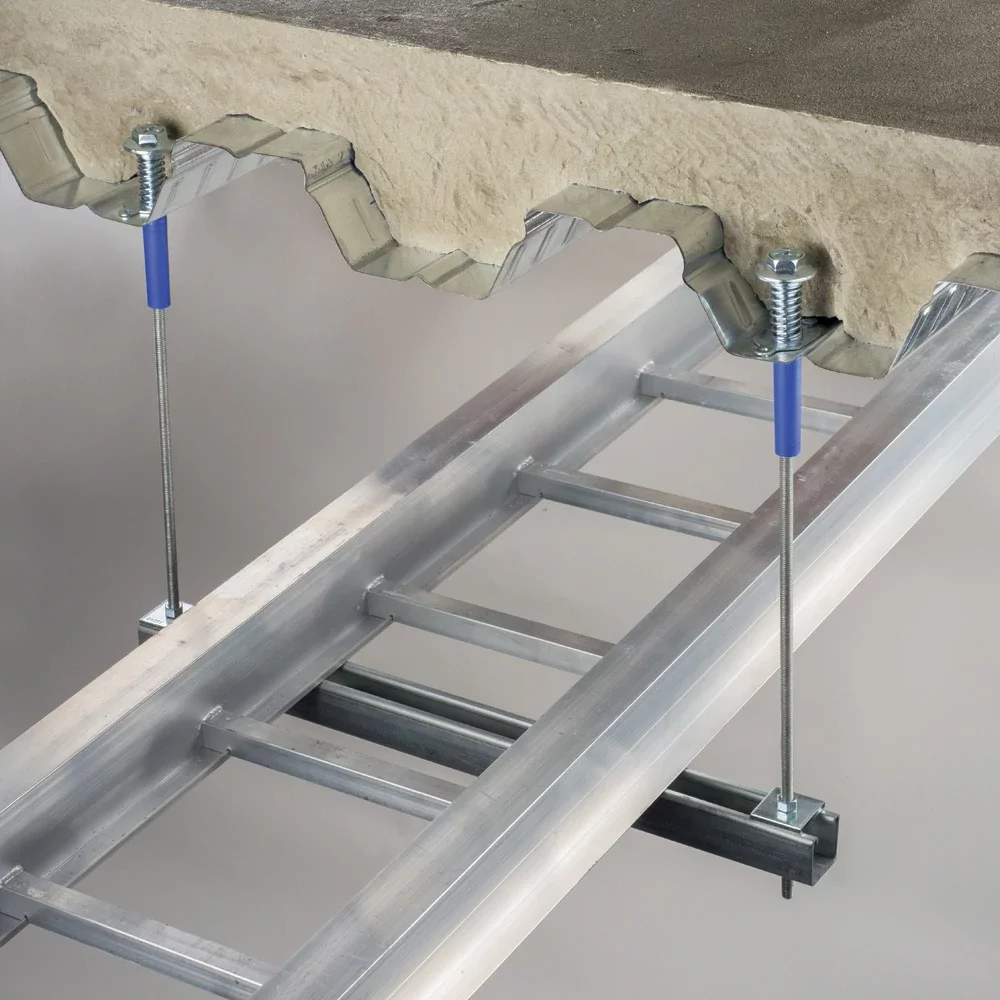 - Set in place through a drilled hole in the metal decking before the concrete is poured