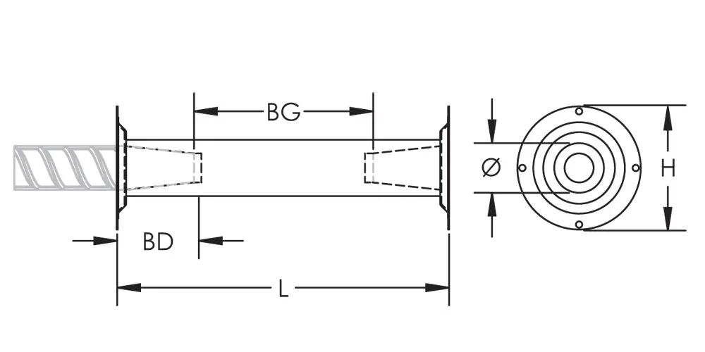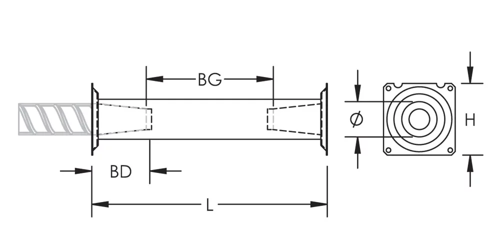 Used in segmental pour applications. The addition of two form saving plates allows the coupler to be used in keyway applications where the coupler is attached to formwork at both ends. Permanent form saving plates allow easy attachment to the forms, eliminating costly damage to the forms.
