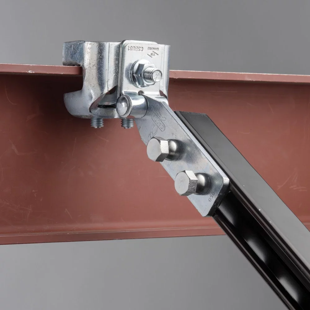 This code-compliant Structural Attachment is part of the nVent CADDY line of innovative rigid bracing system, designed to provide superior performance and meet the highest seismic load requirements. Its innovative design allows quick and easy installation onto both top or bottom flange of a wide range of steel I-Beams. Its snap-off bolts make inspection of seismic sway braces simple.