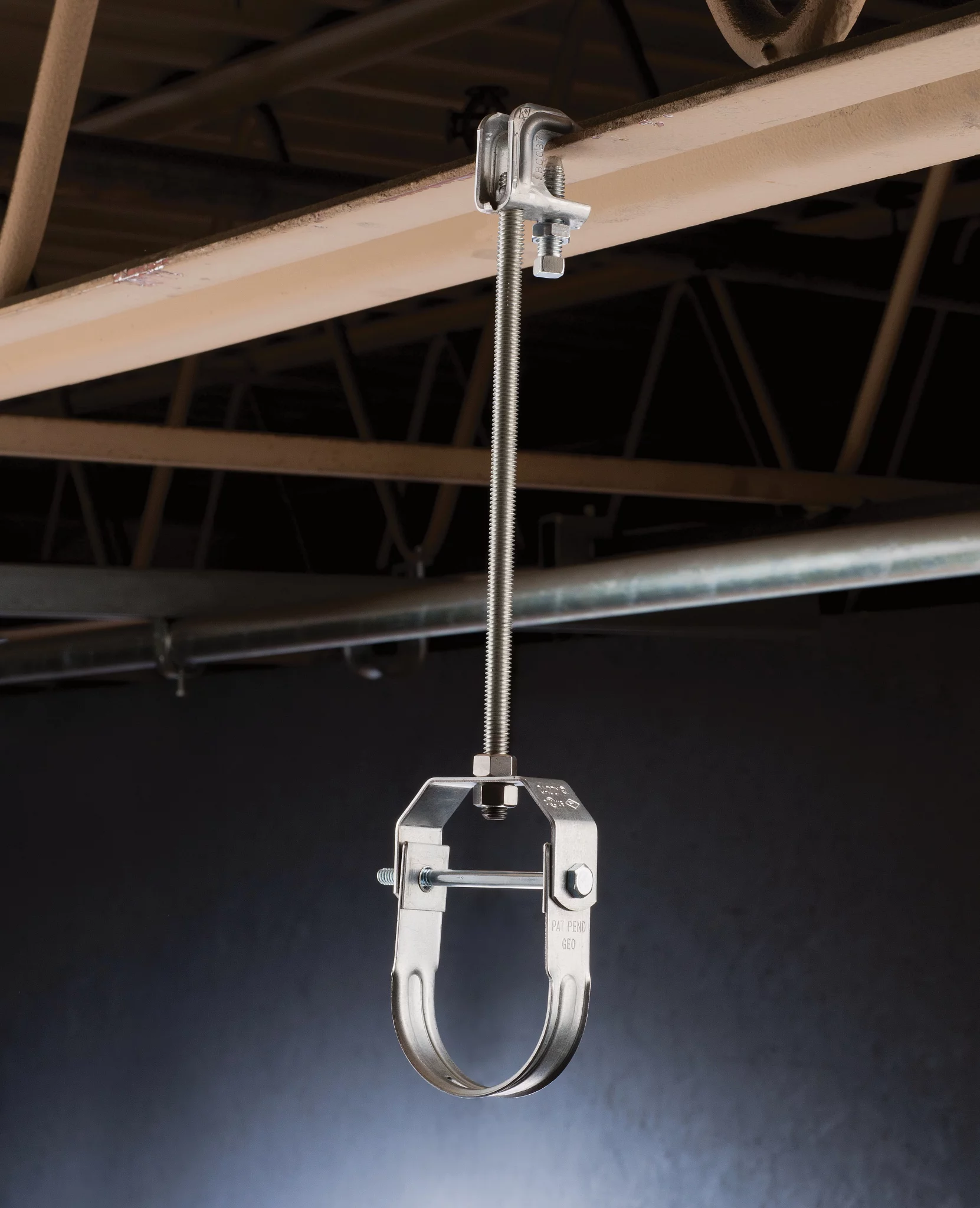 - Clevis bottom pivots to allow pipe to be fed from either direction