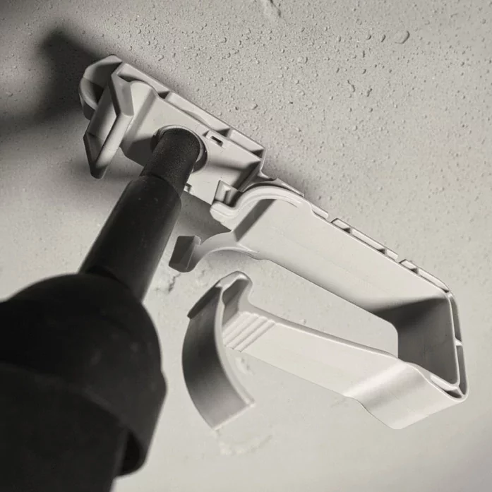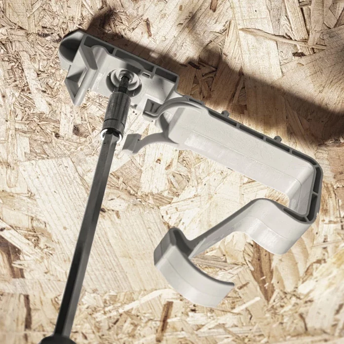 - Clips onto nozzle of gas or battery-actuated nail guns allowing for hands-off installation at structure or from the floor using a pole