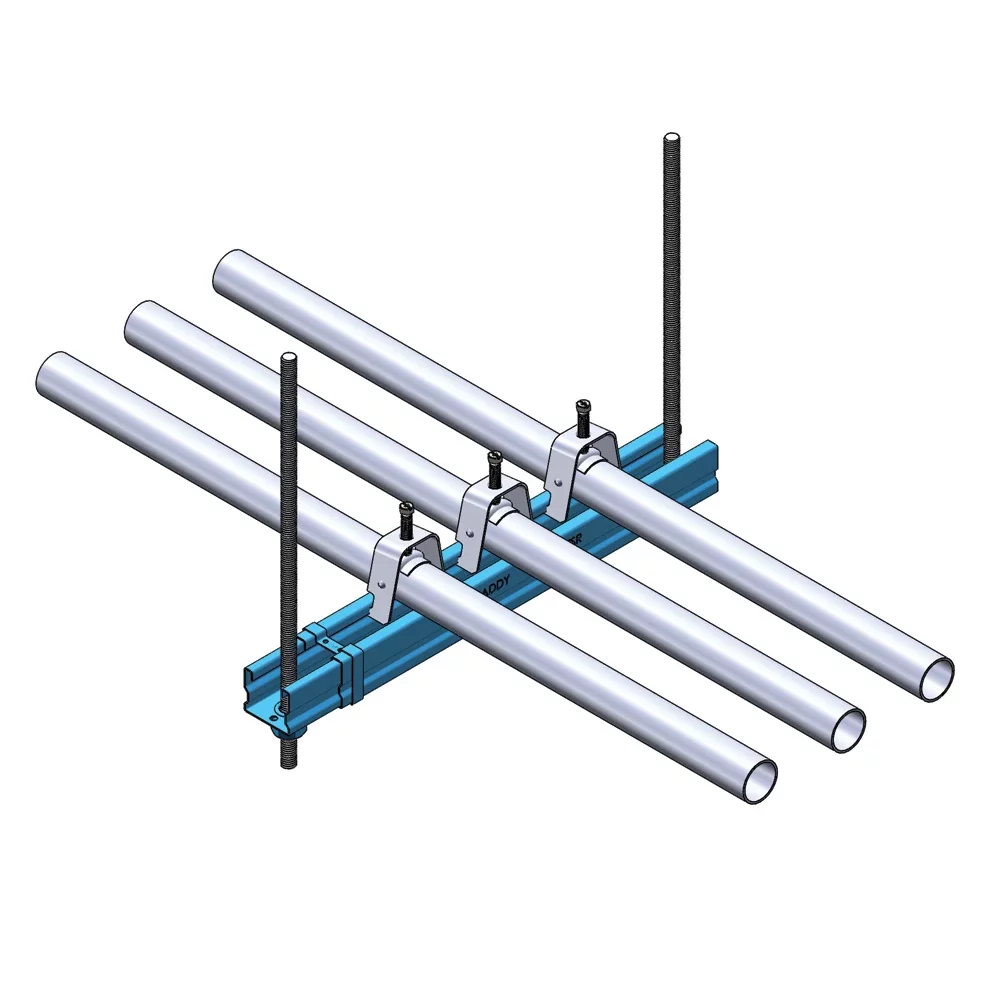 - Soporta hasta siete tubos conduit de 2" (50 DN), hasta seis tuberías de 2" (50 DN) llenas de agua a un espaciamiento de 3 m y bandeja portacables de hasta 450 mm de ancho